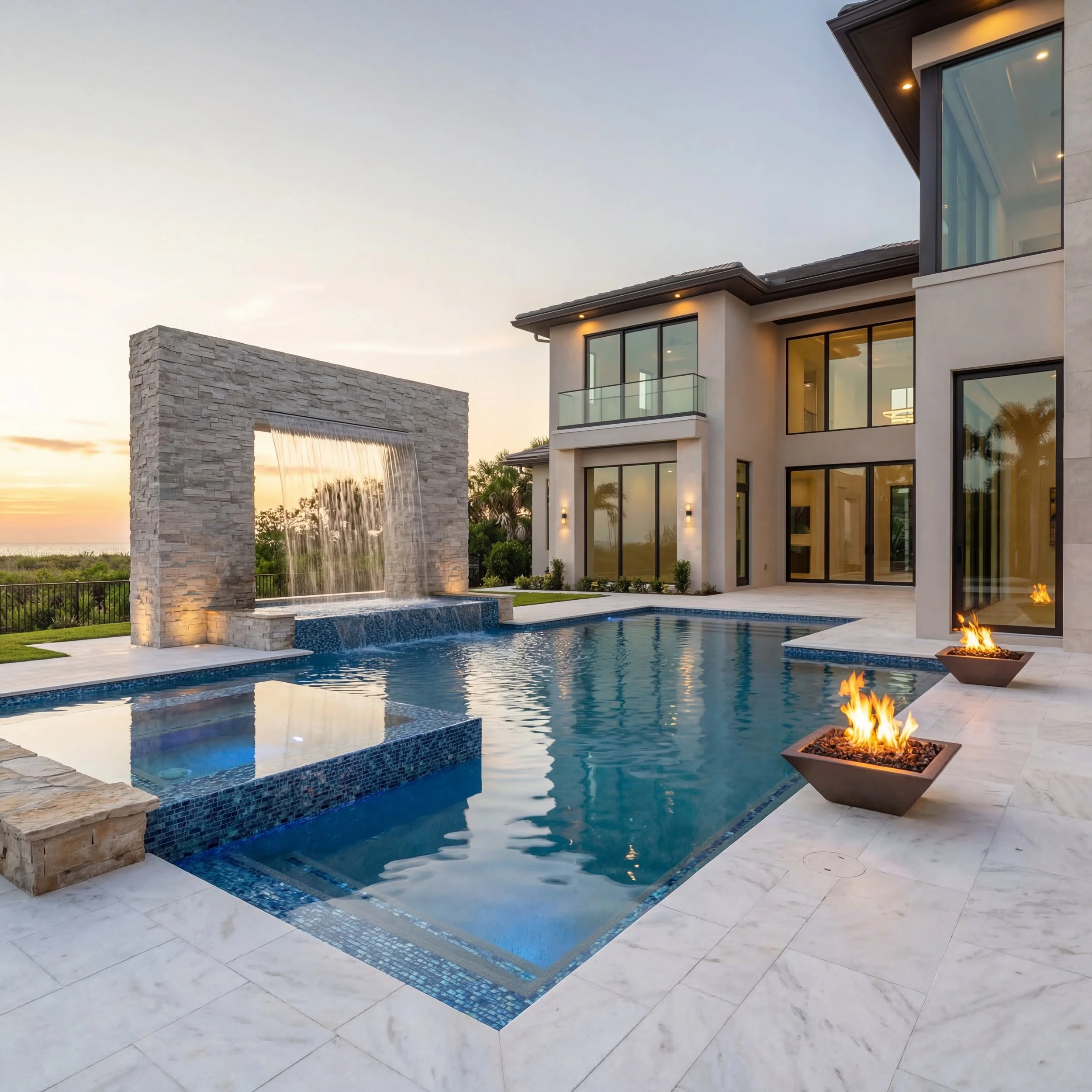 Custom water features and fire accents